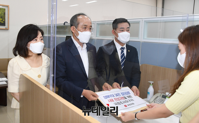 전주혜· 추경호· 신원식 국민의힘 의원이 26일 오전 국회 의안과에서 '청해부대 34진 집단감염 사태 진상규명을 위한 국정조사 요구서'를 제출하고 있다. (사진=공동취재단)