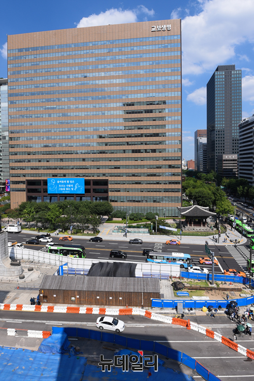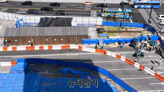 서울시가 광화문 광장 재구조화 공사를 진행하기 위해 '세월호 기억공간' 철거를 예고한 26일 오후 서울 종로구 광화문 광장 세월호 기억공간을 찾은 시민사회단체 회원이 '세월호 기억관' 철거 중단을 요구하는 손 팻말을 들고 농성을 하고 있다.
