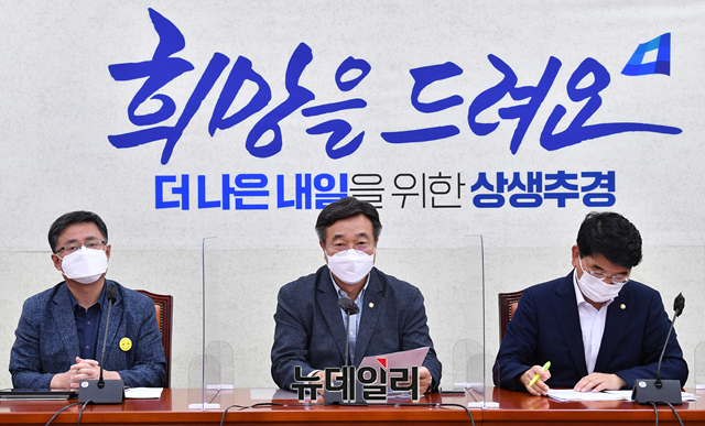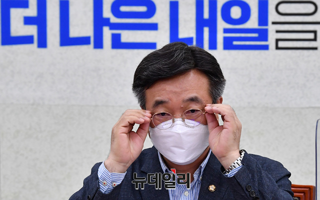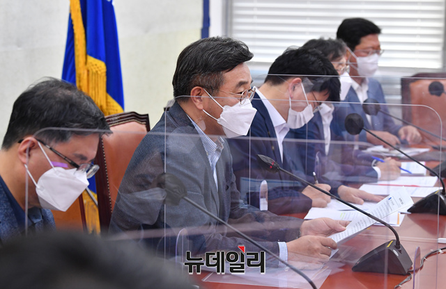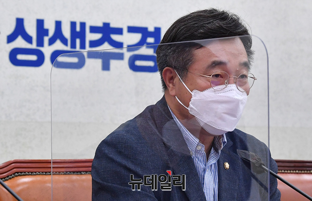 윤호중 더불어민주당 원내대표가 27일 오전 국회에서 열린 원내대책회의에 참석해 모두발언을 하고 있다. (사진=공동취재단)