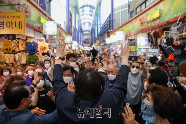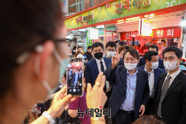 대선 출마를 선언한 윤석열 전 검찰총장이 27일 오후 부산 중구 깡통시장을 방문해 상인들과 대화를 나누고 있다. (사진=윤석열캠프)
