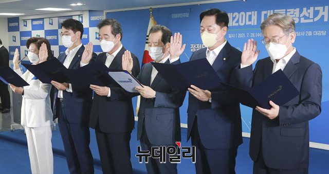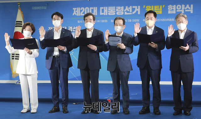 더불어민주당 대선 예비후보들이 28일 오전 서울 여의도 중앙당사에서 열린 제20대 대선 후보자 원팀협약식에서 정정당당 경선 선서를 하고 있다. (왼쪽부터 추미애, 박용진, 이낙연, 정세균, 김두관, 이재명 예비후보) (사진=공동취재단)
