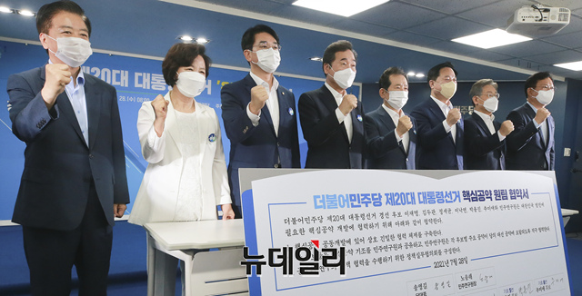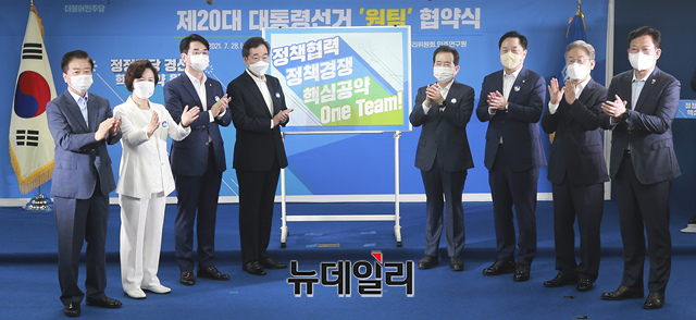 더불어민주당 대선 예비후보들이 28일 오전 서울 여의도 중앙당사에서 열린 제20대 대선 후보자 원팀협약식에서 기념사진을 촬영하고 있다. (왼쪽부터 추미애, 박용진, 이낙연, 정세균, 김두관, 이재명 예비후보) (사진=공동취재단)