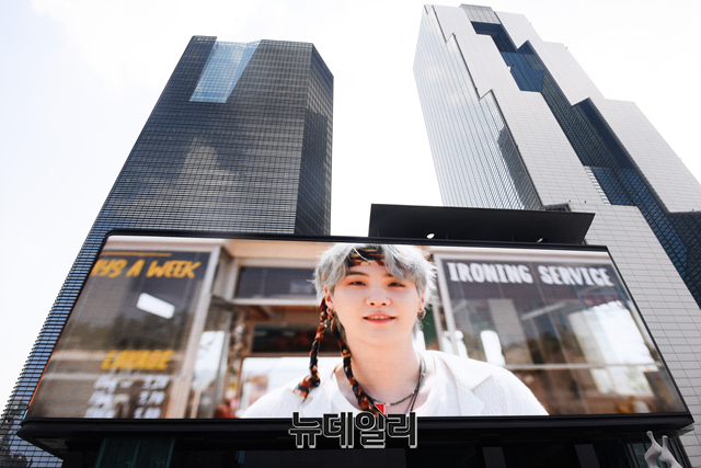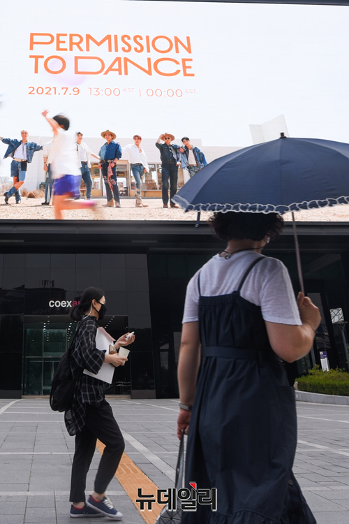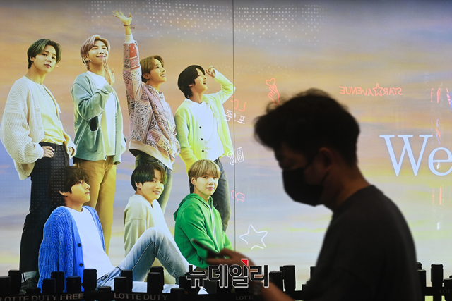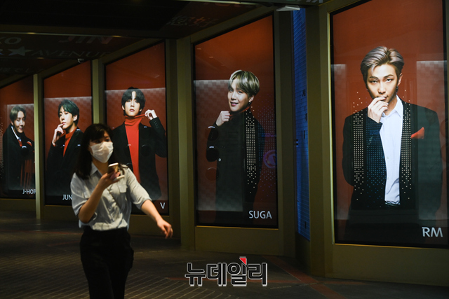 그룹 방탄소년단(BTS)이 9주 연속 미국 빌보드 메인 싱글차트 '핫 100' 1위를 수성 가운데 28일 서울 중구 롯데면세점 스타의거리와 강남구 삼성역 일대에 방탄소년단(BTS) 영상물이 상영되고 있다.