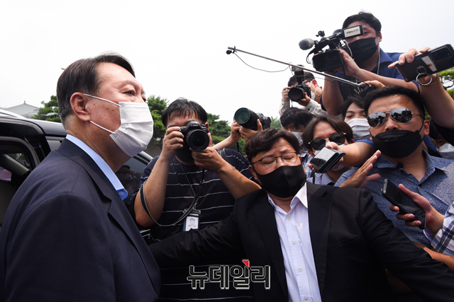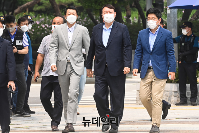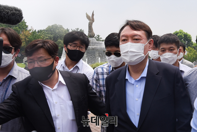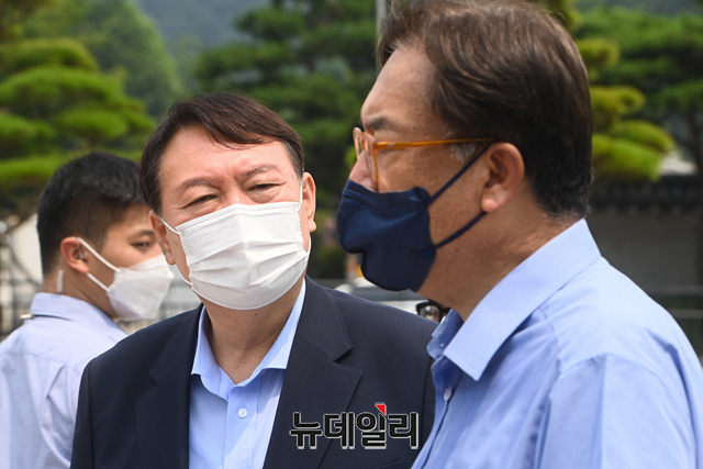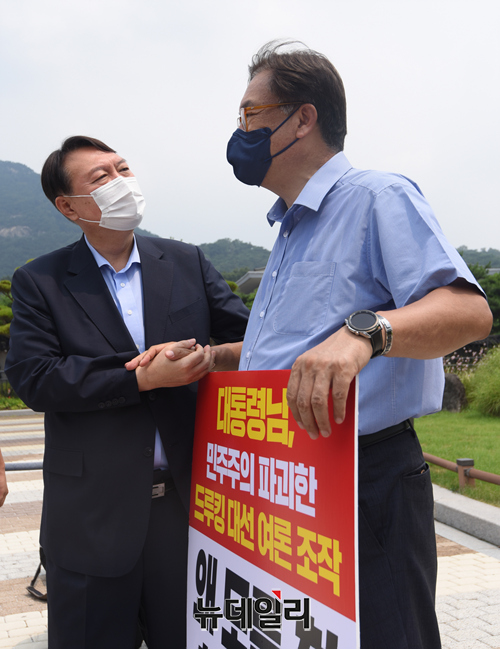윤석열 대선 예비후보가 29일 오전 서울 종로구 청와대 분수대 앞에서 드루킹 댓글 조작 사건과 관련해 문재인 대통령의 사과를 촉구하며 1인 시위를 하고 있는 국민의힘 정진석 의원을 방문하고 있다.