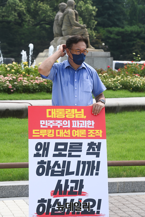 정진석 국민의힘 의원이 29일 오전 서울 종로구 청와대 분수대 앞에서 '드루킹 사건'을 관련해 문재인 대통령의 사과를 촉구하는 1인 시위를 하고 있다.