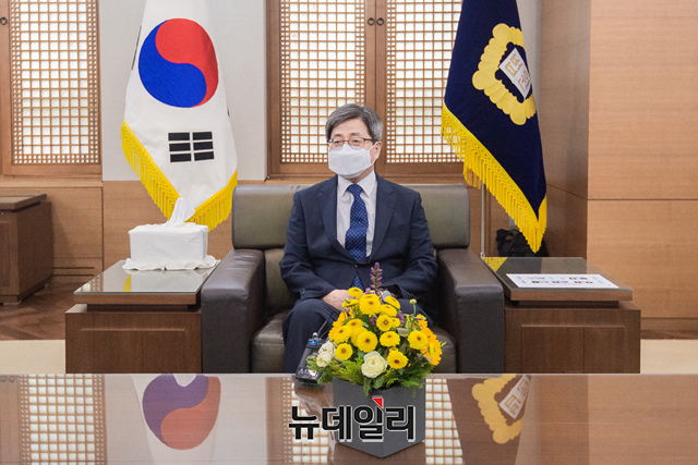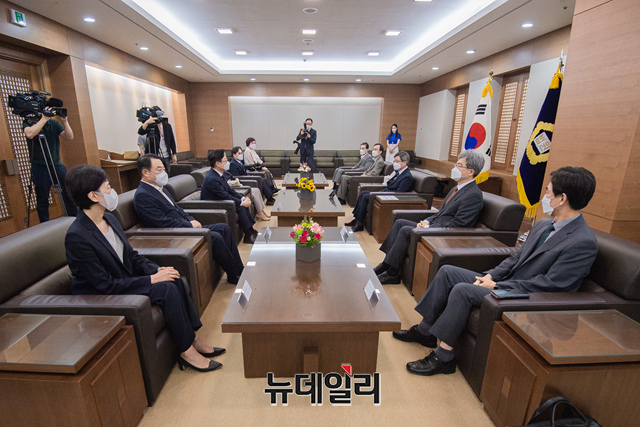 김명수 대법원장이 29일 서울 서초구 대법원에서 '대법관후보추천위원회' 회의에 앞서 박은정 위원장, 박범계 장관 및 대법관후보추천위원들을 접견하고 있다. (사진=공동취재단)