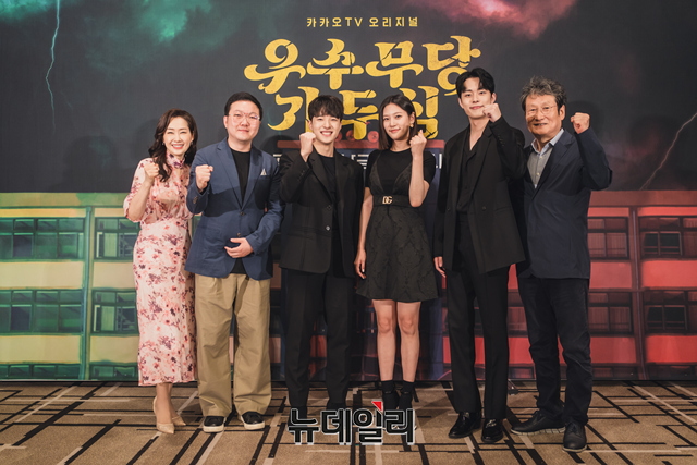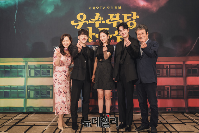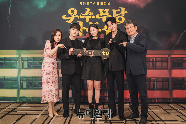 배우 배해선(왼쪽부터), 남다름, 김새론, 가수 겸 배우 유선호, 배우 문성근이 29일 오후 온라인으로 진행된 카카오TV 첫 판타지 드라마 '우수무당 가두심(연출 박호진, 송제영)' 제작발표회에서 포토타임을 갖고 있다.'우수무당 가두심'은 원치 않는 운명을 타고난 소녀 무당 가두심과 원치 않게 귀신을 보게 된 엄친아 '우수'! 위기의 십팔세를 무사히 넘기기 위해 함께 학교의 미스터리를 해결해가는 고교 퇴마로그를 다룬 웹드라마다. 30일 밤 8시 첫 방송. (사진=카카오TV)
