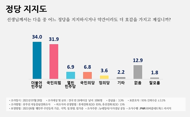 정당지지율은 4주 만에 오차범위 내에서 역전 현상을 보였다.민주당이 지난 3일 조사 때보다 4.7%p 올라 34.0%를 기록했고, 국민의힘은 4.1%p 떨어진 31.9%였다. 지난 3일 조사에서는 국민의힘이 36.0%, 민주당이 29.3%였다. 열린민주당(6.9%), 국민의당(6.8%), 정의당(3.6%)이 뒤를 이었다. 지지정당이 없다는 응답은 12.9%였다. 기타는 2.2%, 잘모름은 1.8%였다.이번 조사는 유무선 자동응답 전화 조사 방식으로 진행됐으며, 휴대전화 RDD(무작위 추출) 85%, 유선전화 RDD 15% 비율로 조사했다. 최종 응답률은 3.3%, 표본오차는 95% 신뢰수준에서 ±3.1%p다. 조사 완료 후 지난 6월 행정안전부 주민등록인구를 기준으로 지역별·성별·연령별 가중값을 부여(림 가중)했다.여론조사 관련 자세한 사항은 중앙선거여론조사심의위원회 홈페이지를 참고하면 된다.