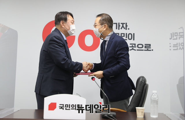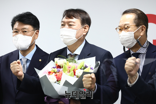 윤석열 대선 예비후보가 30일 오후 서울 여의도 국민의힘 중앙당 당사를 방문해 권영세 대외협력위원장인에게 입당원서를 제출한 뒤 기념촬영을 하고 있다. (사진=공동취재단)