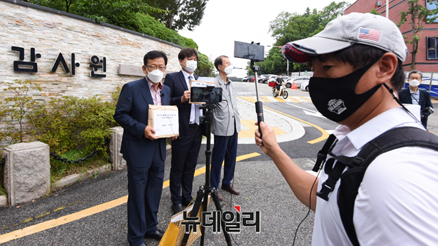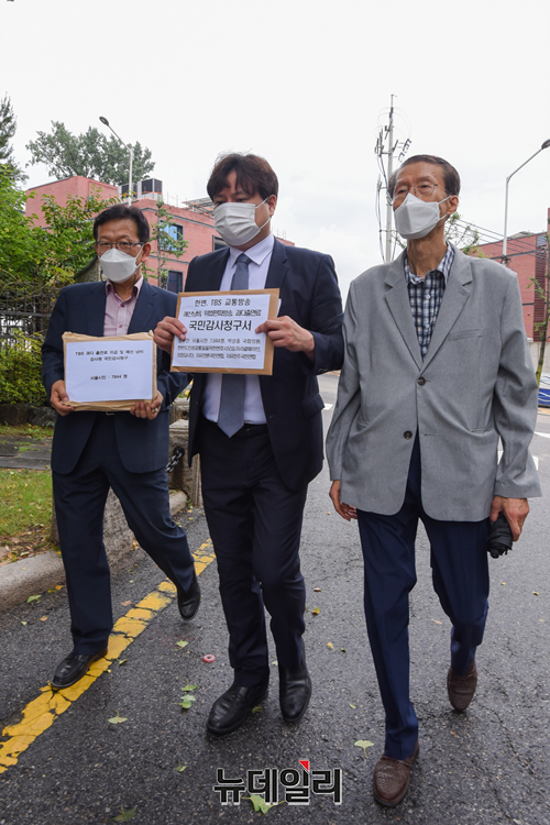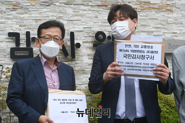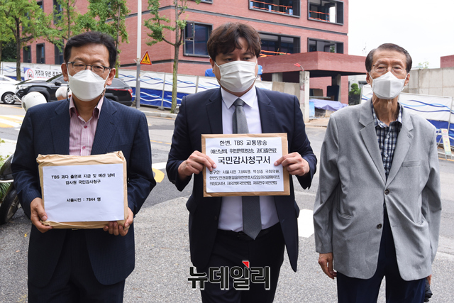 한반도인권과통일을위한변호사모임(한변)이 2일 오전 서울 종로구 감사원 정문에서 'TBS 교통방송의 예산낭비, 위법 편파방송, 과다출연료 등'에 대한 감사를 청구하기에 앞서 입장을 밝히고 있다.한변은 "국민감사청구서에 서울시민 7,845명과 박성중(서울 서초을) 의원 및 시민단체들의 서명을 받았다"며 "김어준의 뉴스공장은 지난 4.7 재보궐 선거에서 '왜곡 선동의 극치' '편향 방송의 끝판왕'이라는 평가까지 받으며 마치 민주당 선대위원장의 역할을 자처했다"고 말했다.기자회견에는 김태훈 한변 상임대표(오른쪽 첫 번째부터), 박주현 사무총장, 석동현 공동대표가 참석했다.