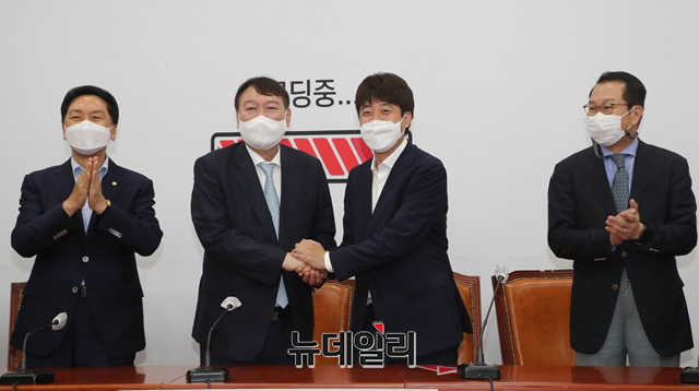 이준석 국민의힘 대표가 2일 오전 국회에서 윤석열 대선 예비후보를 접견하고 인사를 나누고 있다. (사진=공동취재단)