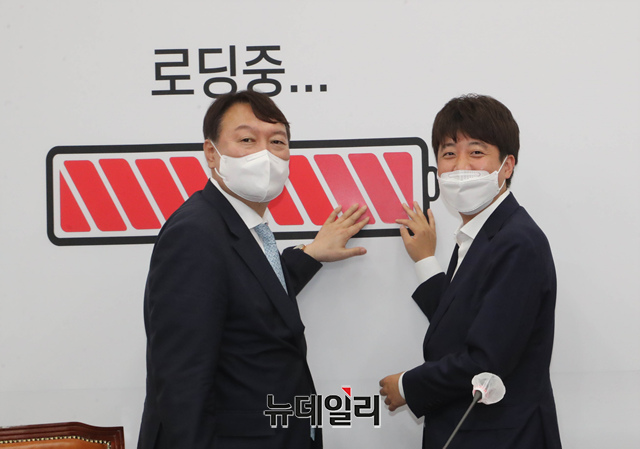 이준석 국민의힘 대표가 2일 오전 국회에서 윤석열 대선 예비후보를 접견하고 기념사진을 촬영하고 있다. (사진=공동취재단)