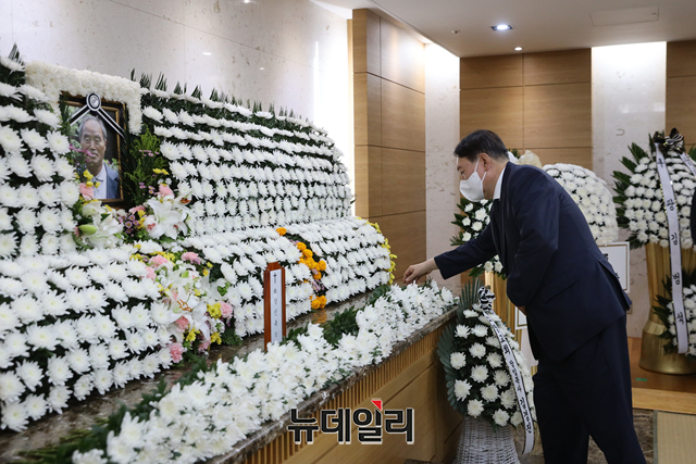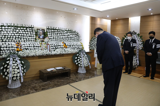 윤석열 국민의힘 대선 예비후보(왼쪽)가 2일 오후 서울 송파구 서울아산병원 장례식장에 마련된 故 강신옥 전 의원의 빈소를 찾아 강 전 의원의 아들 강한승 쿠팡 대표를 위로하고 있다.