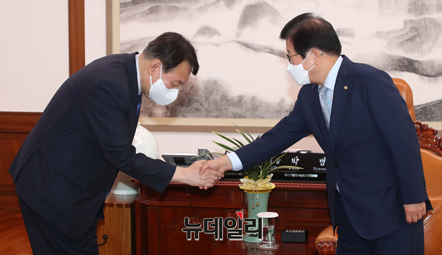 국민의힘 대선 예비후보인 윤석열 전 검찰총장이 3일 오전 국회에서 박병석 국회의장을 예방하고 악수를 나누고 있다. (사진=공동취재단)