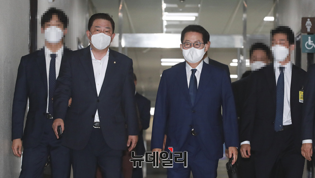 박지원 국가정보원장과 김병기 더불어민주당 간사가 3일 오전 국회에서 열린 정보위원회 전체회의 앞두고 위원장실로 이동하고 있다. (사진=공동취재단)