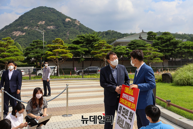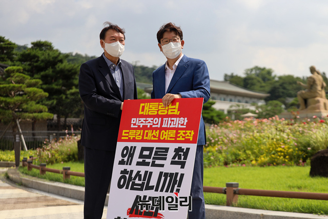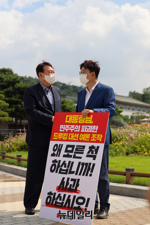 윤석열 국민의힘 대선 주자가 4일 오전 서울 종로구 청와대 분수대 앞에서 '드루킹 댓글 조작 사건'과 관련해 문재인 대통령의 사과를 촉구하며 릴레이 1인 시위를 하고 있는 권성동 의원을 만나 대화를 나누고 있다. (사진=윤석열캠프)