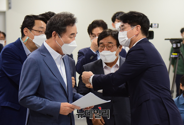 이낙연·박용진 더불어민주당 대선 예비후보가 4일 오전 국회 소통관에서 인사를 나누고 있다.