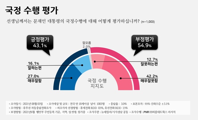 'K방역' 자화자찬, 김여정 '하명' 논란에도… 文 부정평가 54.9%, 긍정평가 43.1%국민의힘 지지층선 '文 부정평가' 96.1%… 민주당 지지층선 '文 긍정평가' 86.3%