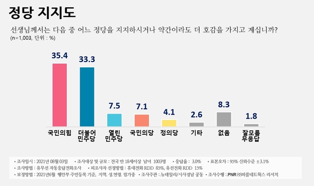 정당 지지율은 한 주 만에 오차범위 내에서 역전 현상이 나타났다.민주당이 지난달 28일 조사 때보다 0.7%p 떨어진 33.3%를 기록한 반면 국민의힘은 3.5%p 상승한 35.4%를 기록했다. 지난달 28일 조사에서는 국민의힘이 31.9%, 민주당이 34.0%였다. 열린민주당(7.5%), 국민의당(7.1%), 정의당(4.1%)이 뒤를 이었다. 지지 정당이 없다는 응답은 8.3%였다. 기타는 2.6%, 잘모름은 1.8%였다.이번 조사는 유무선 자동응답 전화 조사 방식으로 진행됐으며, 휴대전화 RDD(무작위 추출) 85%, 유선전화 RDD 15% 비율로 조사했다. 최종 응답률은 3.0%, 표본오차는 95% 신뢰수준에서 ±3.1%p다. 조사 완료 후 지난 6월 행정안전부 주민등록인구를 기준으로 지역별·성별·연령별 가중값을 부여(림 가중)했다.여론조사 관련 자세한 사항은 중앙선거여론조사심의위원회 홈페이지를 참고하면 된다.