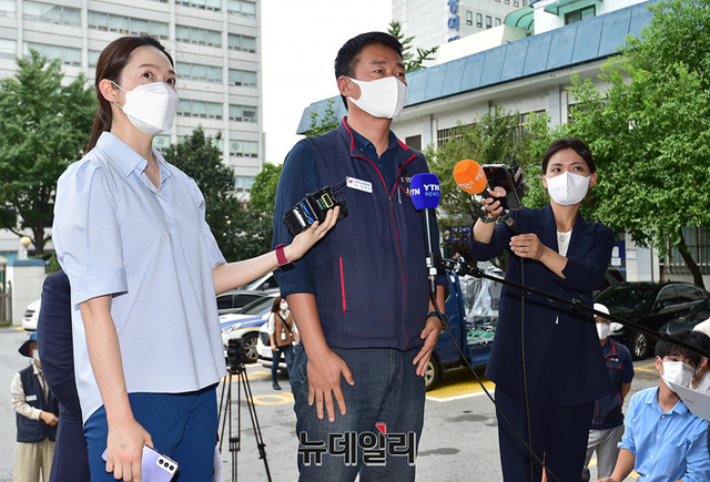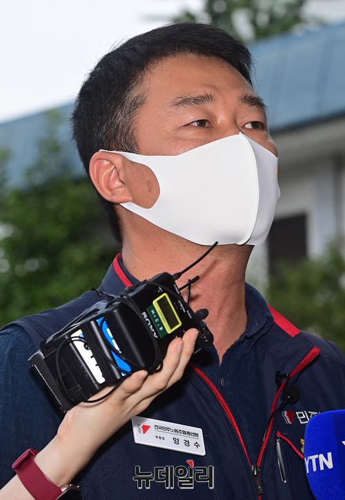 지난 7월 3일 서울도심에서 방역지침을 위반하고 8,000여 명이 모여 전국노동자대회를 주도한 혐의를 받고 있는 양경수 민노총위원장이 4일 오후 서울 종로구 종로경찰서에 피의자 신분으로 출석하고 있다. 양 위원장은 출석하며 "정부가 방역실패 책임을 민노총에 돌리려는 시도는 실패했다"고 말했다.