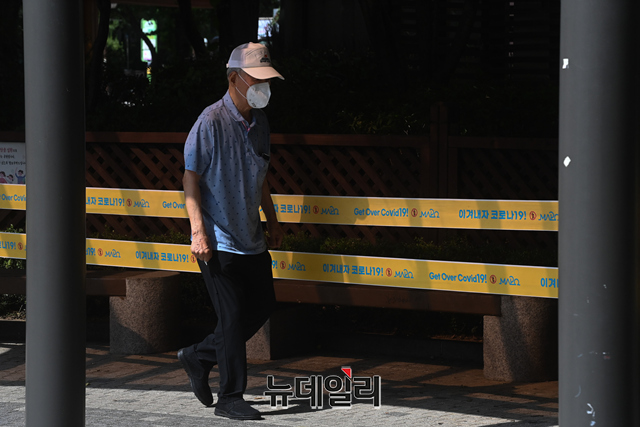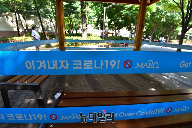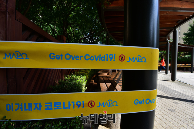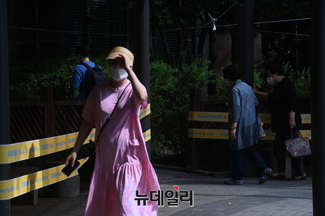 코로나19 4차 대유행이 한 달 가까이 이어지고 있는 4일 오후 서울 마포구의 다중이용시설물에 전면 폐쇄를 알리는 테이핑이 부착됐다. 시민들이 더위를 피해 그늘로 발걸음을 옮기고 있다.중앙방역대책본부는 "0시 기준으로 신규 확진자가 1,664명, 국외유입 사례는 61명이라"고 밝혔다. 이어 "신규 확진자는 지난달 7일(1,212명) 이후 29일째 1천명대로 발생했다"며 "국내 코로나19 누적 확진자 수는 20만 3,926명으로 늘었다"고 전했다.