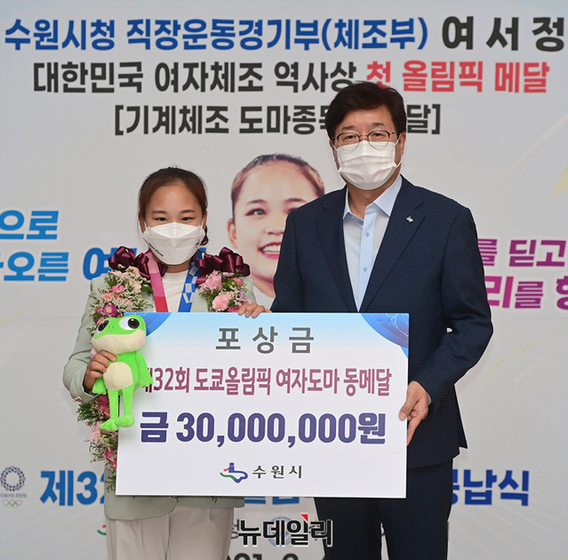 도쿄올림픽 여자 개인 도마부문에서 동메달을 획득한 여서정(수원시청) 선수가 4일 오후 경기 수원시 팔달구 수원시청 로비에서 열린 봉납식에서 염태영 수원시장에게 포상금을 받고 있다. (경기 수원=정상윤 기자)
