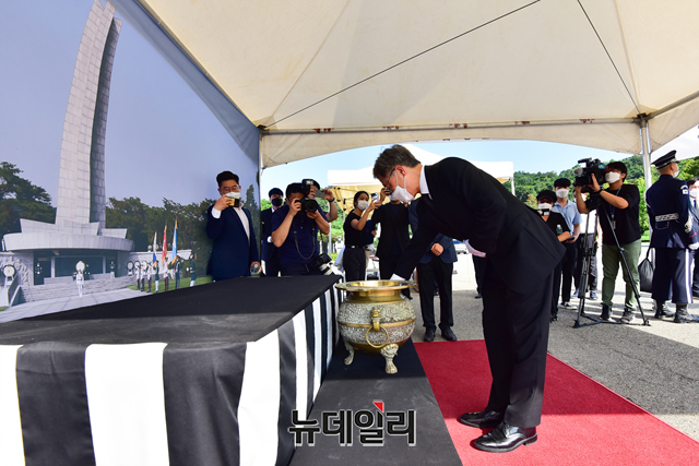 국민의힘 대선 예비후보로 첫 공식일정을 시작한 최재형 전 감사원장이 5일 오전 서울 동작구 국립현충원에 마련된 임시 현충탑 참배소에서 호국영령들의 넋을 기리고 있다.