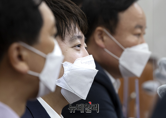 이준석 국민의힘 대표가 5일 오전 국회에서 열린 최고위원회의에서 노트북을 보고 있다. (사진=공동취재단)