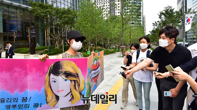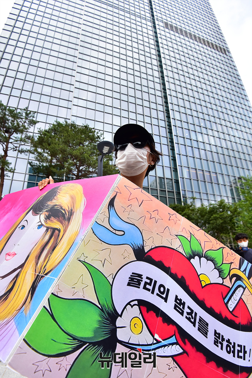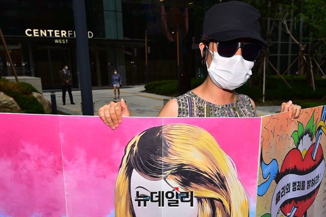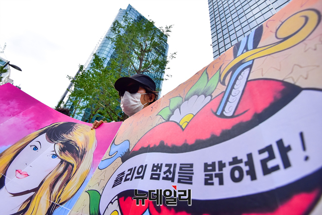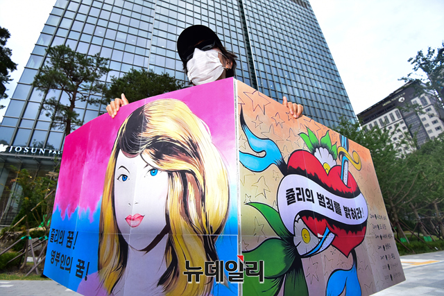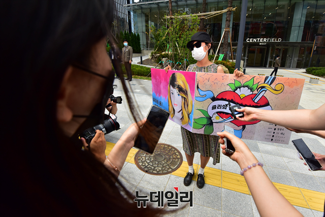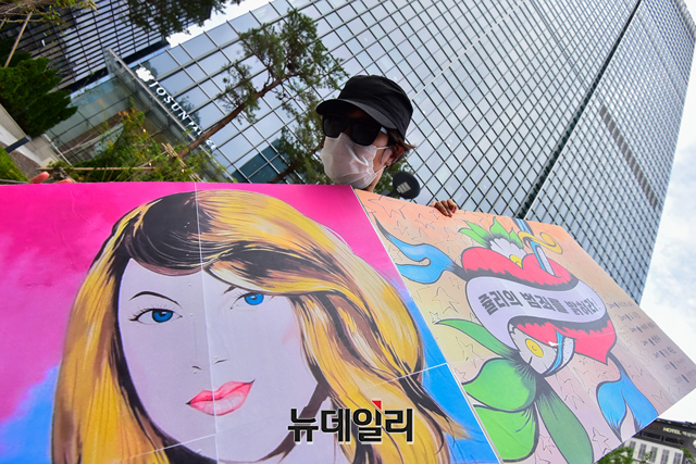 '쥴리의 꿈! 영부인의 꿈! 쥴리의 범죄를 밝혀라!' 그림이 담긴 손 팻말을 든 시민이 6일 오후 서울 강남구 르네상스호텔사거리 일대에서 1인 시위를 벌이고 있다.