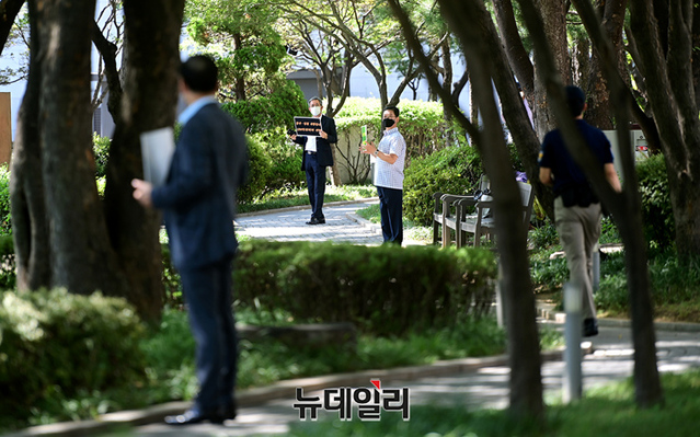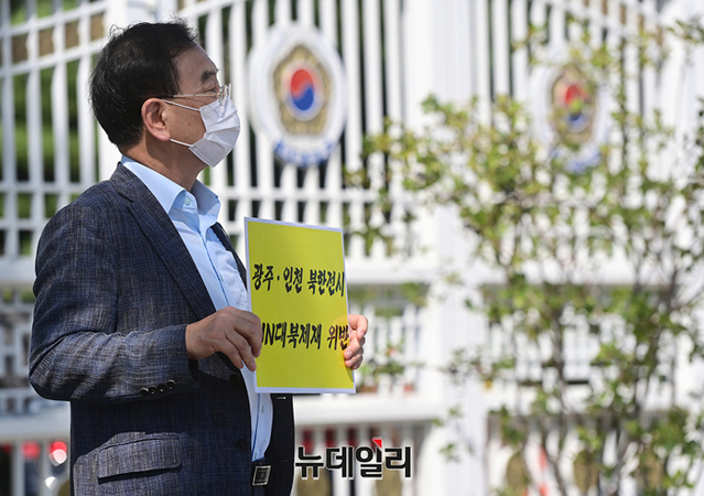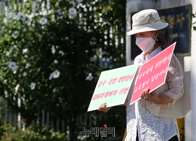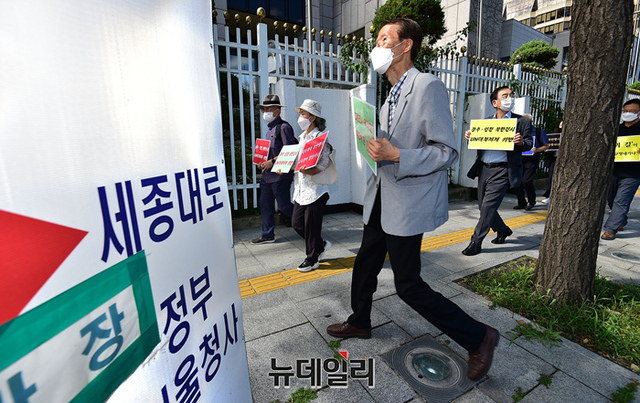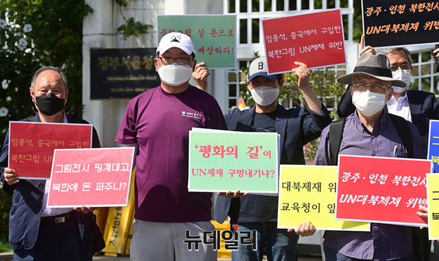 북한인권단체 물망초를 비롯한 시민단체가 9일 오전 서울 종로구 정부서울청사와 외교부 일대에서 남북경제문화협력재단(경문협)이 북한 미술품을 구입해 전시회를 개최한 것을 비판하는 1인시위를 하기 위해 이동하고 있다.이들은 경문협과 통일부 등을 비판하는 손피켓을 들고, 정부서울청사와 외교부 청사를 1인 시위 형식으로 약 70m 가량 늘어서는 인간 띠 잇기 시위를 진행했다.거리두기 4단계 재연장에 따라 집회가 금지돼 1인 시위로 규탄에 나섰지만 경찰과 갈등을 빗기도 했다. 물망초를 비롯해 나라지킴이고교연합, 교육바로세우기운동본부, 한반도인권과통일을위한변호사모임(한변) 등이 참여했다.경문협은 임종석 전 대통령 비서실장이 대표를 맡고 있는 비영리 민간단체다. 국내 방송사 등을 상대로 북한 저작물 사용에 따른 저작권료를 북한을 대리해 받고 있다. 지난해 탈북 국군포로 2명이 북한 김정은을 상대로 한 소송에서 승소하며 법원은 경문협이 법원에 공탁한 현금을 배상하라는 판결을 내렸지만 경문협은 이를 이행하지 않고 있다.