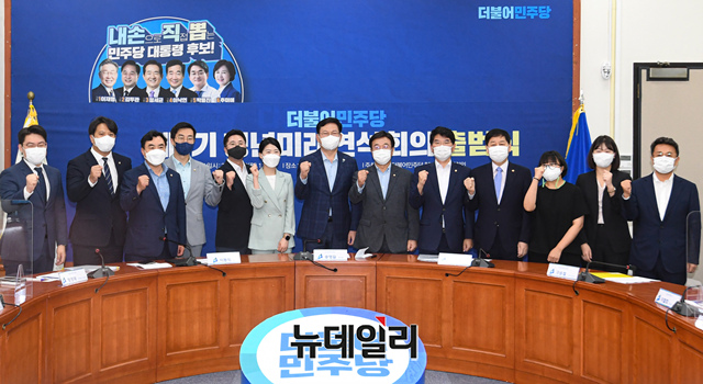 송영길 더불어민주당 대표, 윤호중 원내대표 및 참석자들이 9일 오전 국회에서 열린 제3기 청년미래연석회의 출범식에서 기념촬영을 하고 있다. (사진=공동취재단)