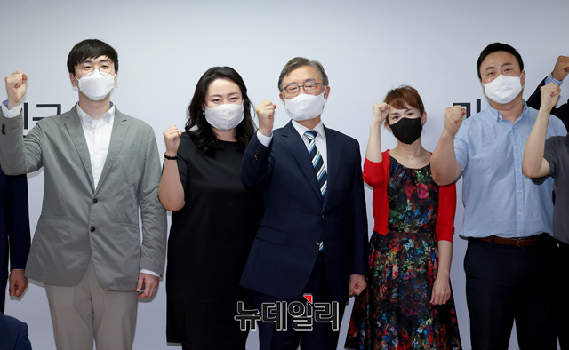 최재형 국민의힘 대선 예비후보가 9일 오전 서울 여의도 대하빌딩 선서사무실에서 열린 선거대책회의에서 자원봉사자들과 기념사진을 촬영하고 있다. (사진=공동취재단)
