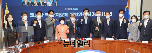 더불어민주당 제5차 코로나 백신.치료제 특별위원회 회의가 9일 오후 국회에서 열린 가운데 참석자들이 구호를 외치고 있다. (왼쪽부터 김영진 의원, 정문섭 진원생명과학 연구소장, 전혜숙 특위위원장, 강창율 셀리드대표, 송영길 대표, 안재용 SK바이오사이언스대표, 김성주의원) (사진=공동취재단)