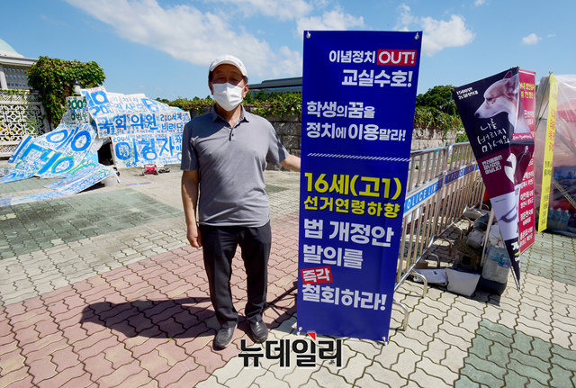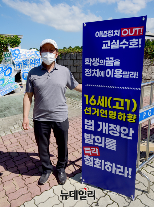 조영달 서울대 사회교육과 교수가 9일 오전 국회 정문 앞에서 선거 연령을 16세로 하향 조정하는 내용의 법안 발의 철회를 요구하는 1인 시위를 하고 있다.