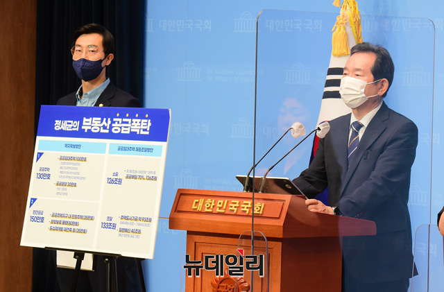 정세균 더불어민주당 대선 예비 후보가 10일 오후 국회 소통관에서 부동산 정책 관련 공약발표를 하고 있다.