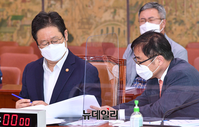 황희 문화체육부 장관과 오영우 1차관이 10일 오후 국회에서 열린 문화체육관광위원회 전체회의에서 대화를 나누고 있다. (사진=공동취재단)