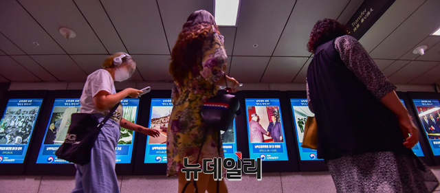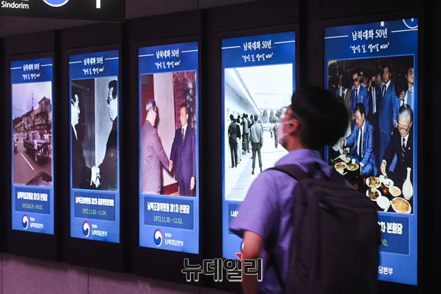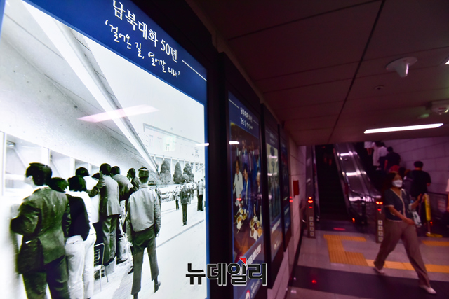 [포토] 서울 1호선 4개 역사에 남북대화 50년 기념 디지털사진 전시