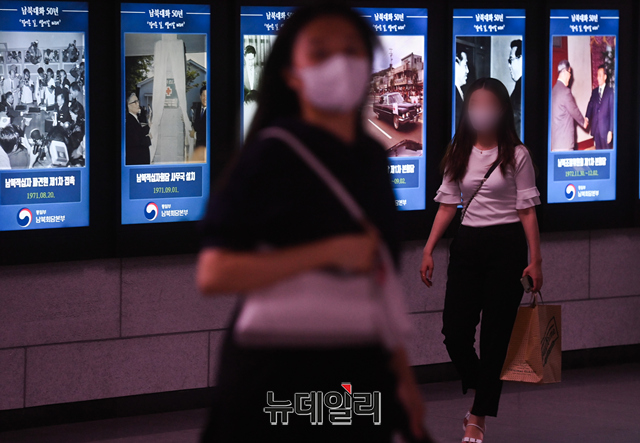 남북대화 50년을 맞아 서울 중구 시청역에 설치된 디지털 사진 전시에 10일 오후 시민들이 지나가며 전시를 관람하고 있다.