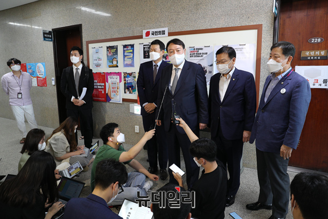 윤석열 국민의힘 대선 예비후보가 11일 오전 국회에서 열린 '더 큰 국민의힘 재선의원 간담회'를 마치고 기자들의 질문에 답하고 있다. (사진=공동취재단)