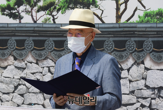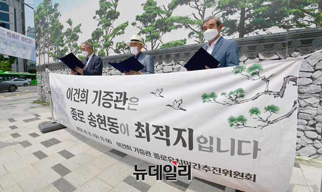 이건희 기증관 종로유치민간추진위원회 공동대표 이순종 서울대 미술대 교수· 김원 건축환경연구소 광장 대표· 황달성 화랑협회장이 11일 서울 종로구 송현동 부지 앞에서 이건희 기증관 송현동 유치 지지 성명을 발표하고 있다.
