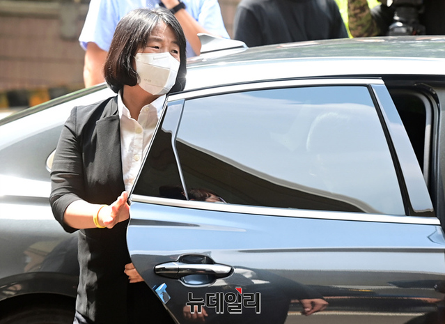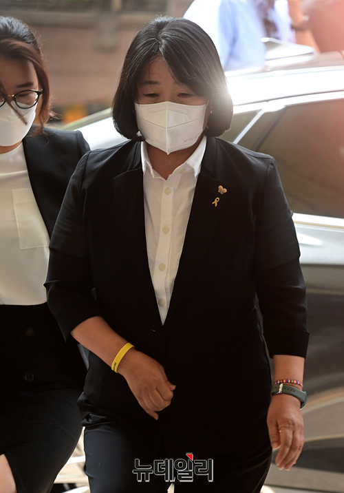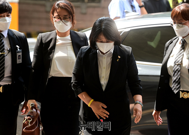 정의기억연대(정의연) 이사장 당시 후원금을 부정 수령하고 사적으로 유용한 혐의를 받고 있는 윤미향 무소속 의원이 11일 오후 서울 마포구 서울서부지방법원에서 열린 첫 공판에 출석하고 있다. 윤 의원은 지난해 9월 기소된 이후 11개월 만에 법원에 모습을 드러냈다.