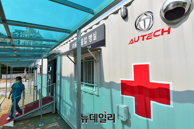코로나19 신규 확진자가 처음으로 2천명 이상 증가한 11일 오후 서울 은평구 서울시립서북병원 주차장에 마련된 이동형 음압병실의 모습.