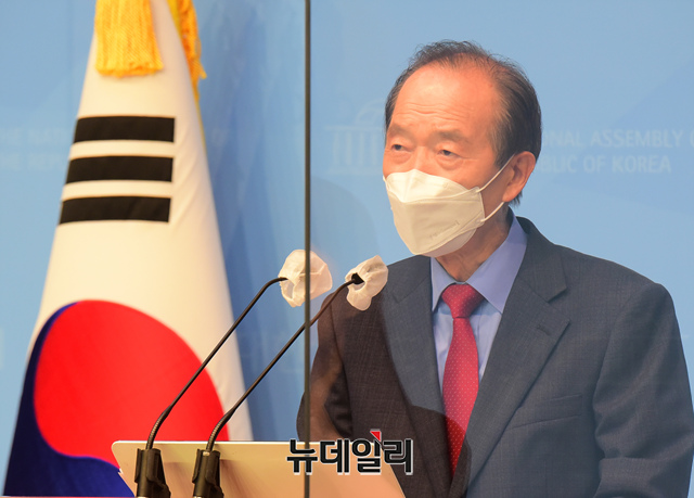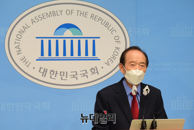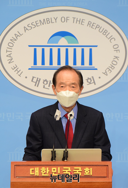 장기표 국민의힘 대선 경선 후보가 12일 오전 국회 소통관에서 탈원전 관련 기자회견을 갖고 있다.