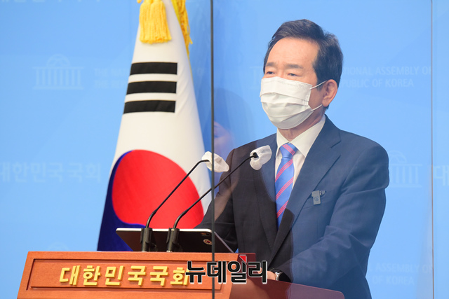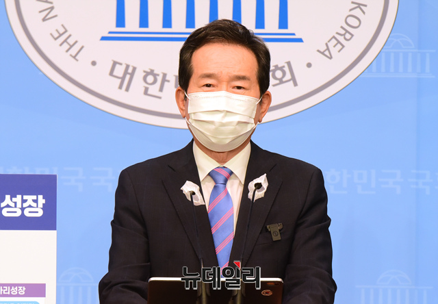 정세균 더불어민주당 대선 경선 후보가 12일 오후 국회 소통관에서 SK노믹스 사람중심 혁신성장 정책을 발표하고 있다.