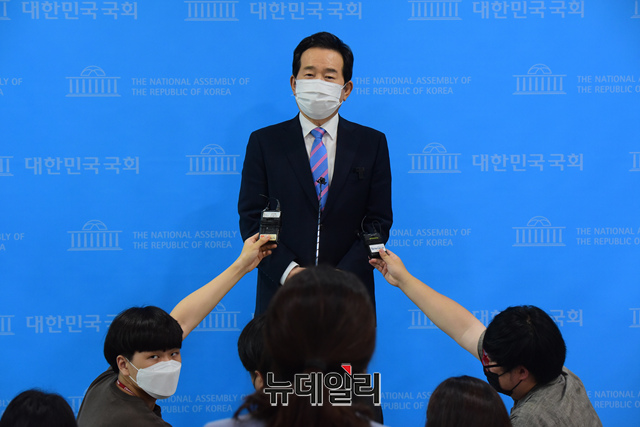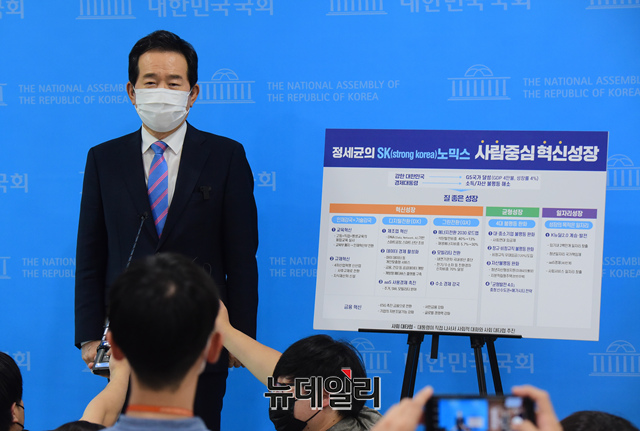 정세균 더불어민주당 대선 경선 후보가 12일 오후 국회 소통관에서 SK노믹스 사람중심 혁신성장 정책을 발표하고 기자들의 질문에 답하고 있다.