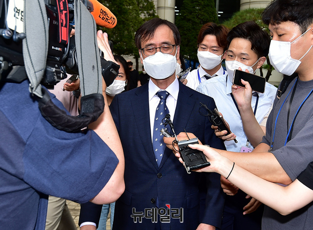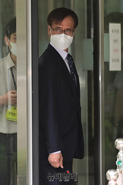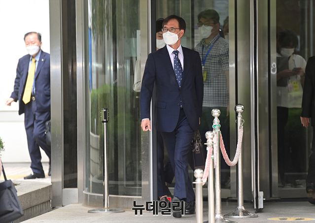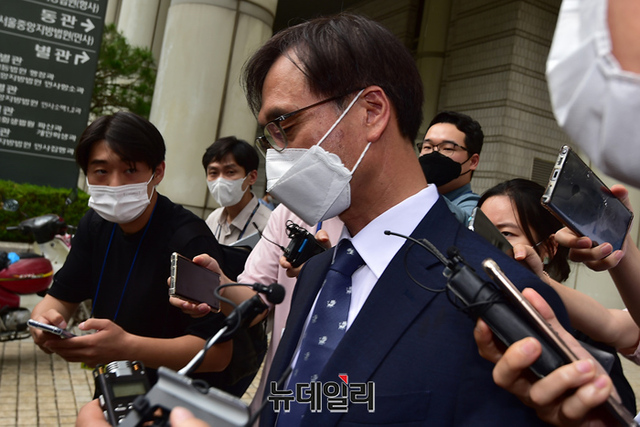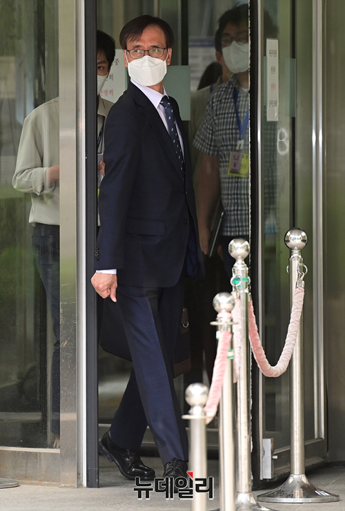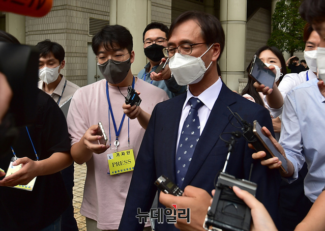 압수수색 과정에서 한동훈 검사장을 폭행한 혐의로 기소된 정진웅 울산지검 차장검사가 12일 오후 서울 서초구 서울중앙지법에서 열린 선고 공판 직후 법원을 나서고 있다. 법원은 정 검사에게 징역 4월에 집행유예 1년을 선고했다.