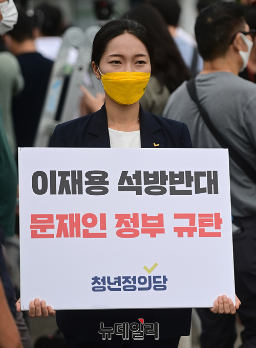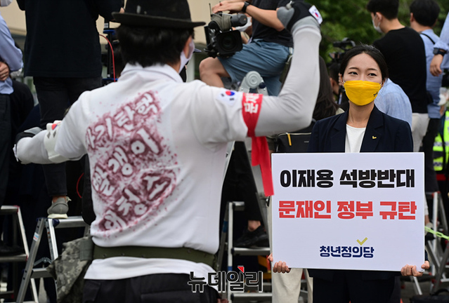 이 부회장의 출소에 앞서 서울구치소 앞은 지지자와 반대단체들이 몰려 각각의 목소리를 높였다. (경기 의왕=정상윤 기자)