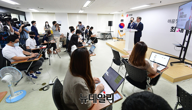 최재형 국민의힘 대선 경선 예비후보가 13일 오전 서울 여의도 대하빌딩 캠프기자실에서 경제 분야 정책비전을 발표하고 기자들의 질문에 답하고 있다.