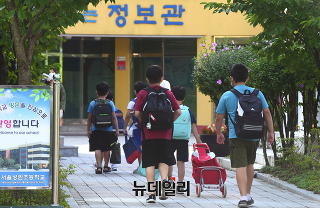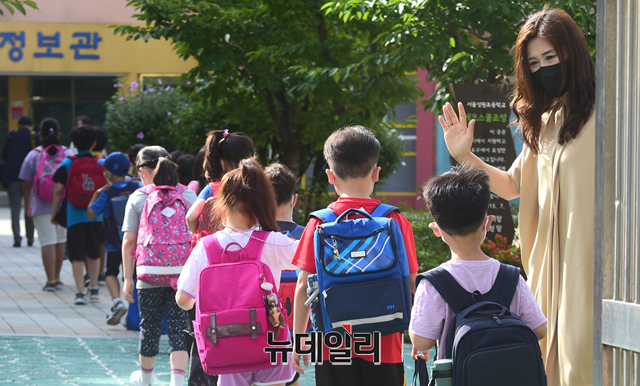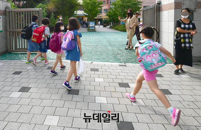 수도권 사회적 거리두기 4단계가 시행되고 있는 17일 오전 서울 마포구의 한 초등학교 학생들이 2학기 개학을 맞이해 등교하고 있다.