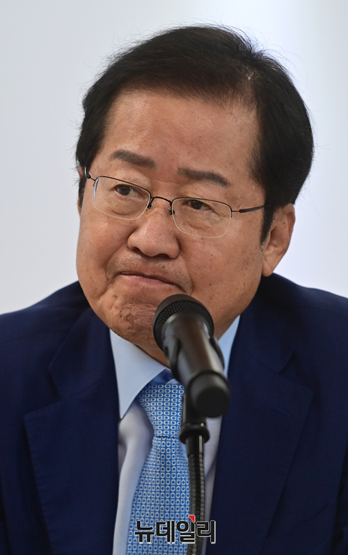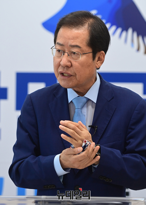 국민의힘 대선 주자인 홍준표 의원이 17일 오전 서울 여의도 캠프에서 제20대 대통령 선거 출마 선언 직후 온라인으로 취재진의 질문에 답하고 있다.